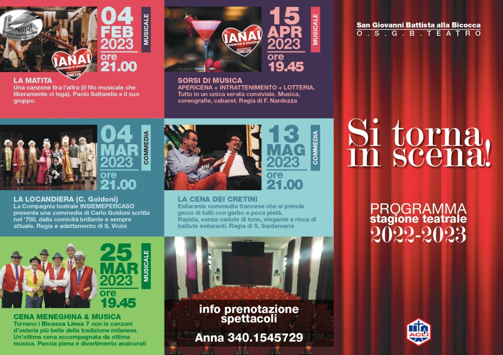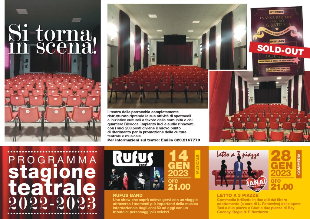 Il Teatro San Giovanni Battista alla Bicocca riprende la sua attività di spettacoli e iniziative parrocchiali e culturali.
