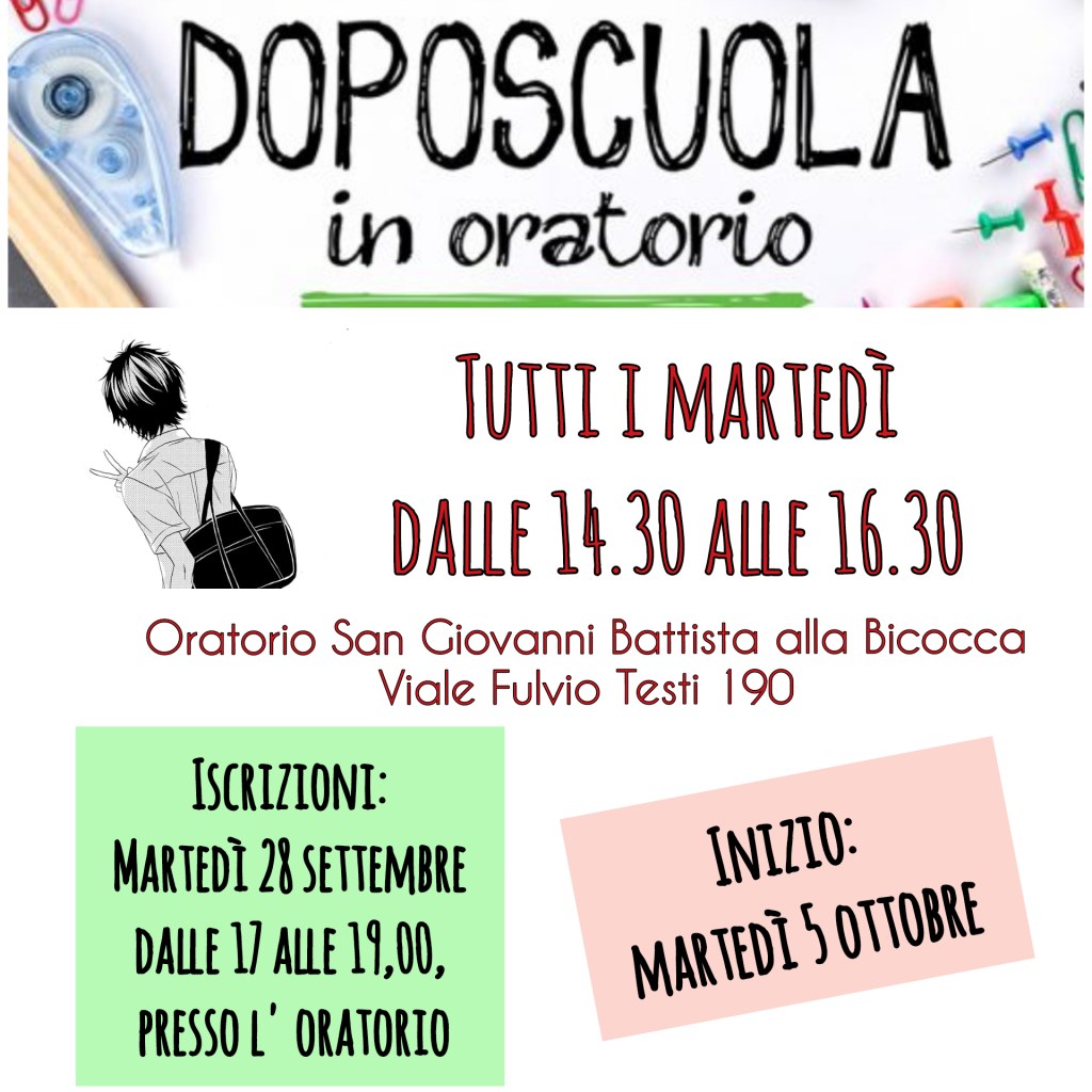 Chiunque avesse voglia di darci una mano è invitato alla riunione dei VOLONTARI DEL DOPOSCUOLA mercoledì 30 settembre alle h 17,00 in oratorio, per ripensarci insieme con creatività e coraggio.